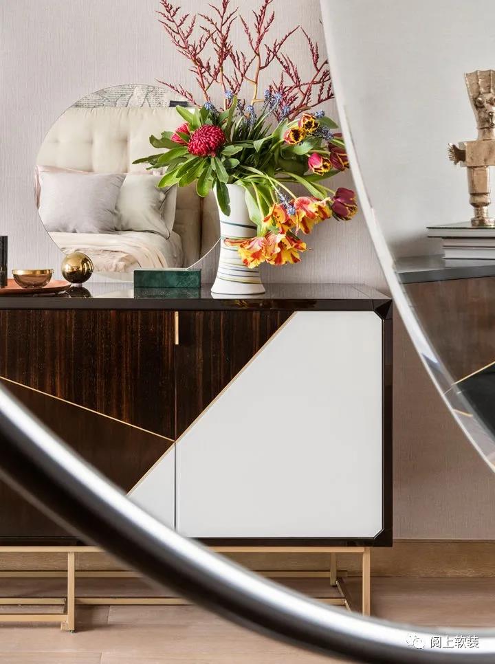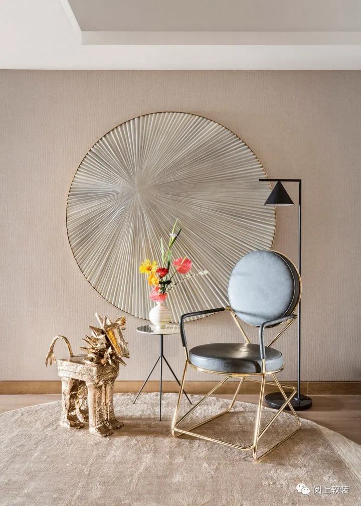 米色地毯來(lái)自意大利家具品牌Paola Lenti,英國(guó)建筑師David Adjaye與意大利家具品牌Moroso合作的Double Zero椅有著鮮明的Art Deco風(fēng)格,與墻上的背景裝飾和桌上的藝術(shù)雕塑一同打造出輕奢感。
