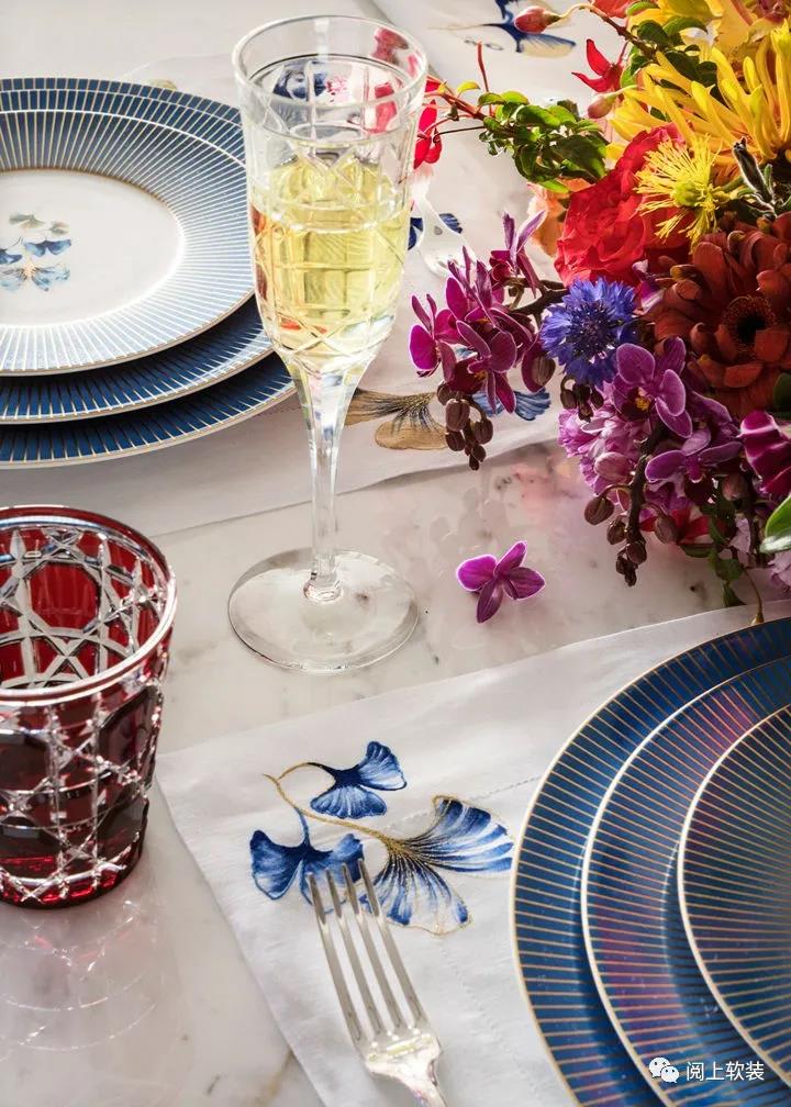 桌上的餐具是Dior Maison的藍(lán)色銀杏系列和Cannage藤格紋系列,“藤格紋”的細(xì)節(jié)來(lái)自拿破侖三世的圓背椅,經(jīng)由Dior家居系列創(chuàng)意總監(jiān)Cordelia de Castellane的重新運(yùn)用,在瓷器餐盤(pán)與高腳杯上展現(xiàn)出Dior的優(yōu)雅與古典之美。