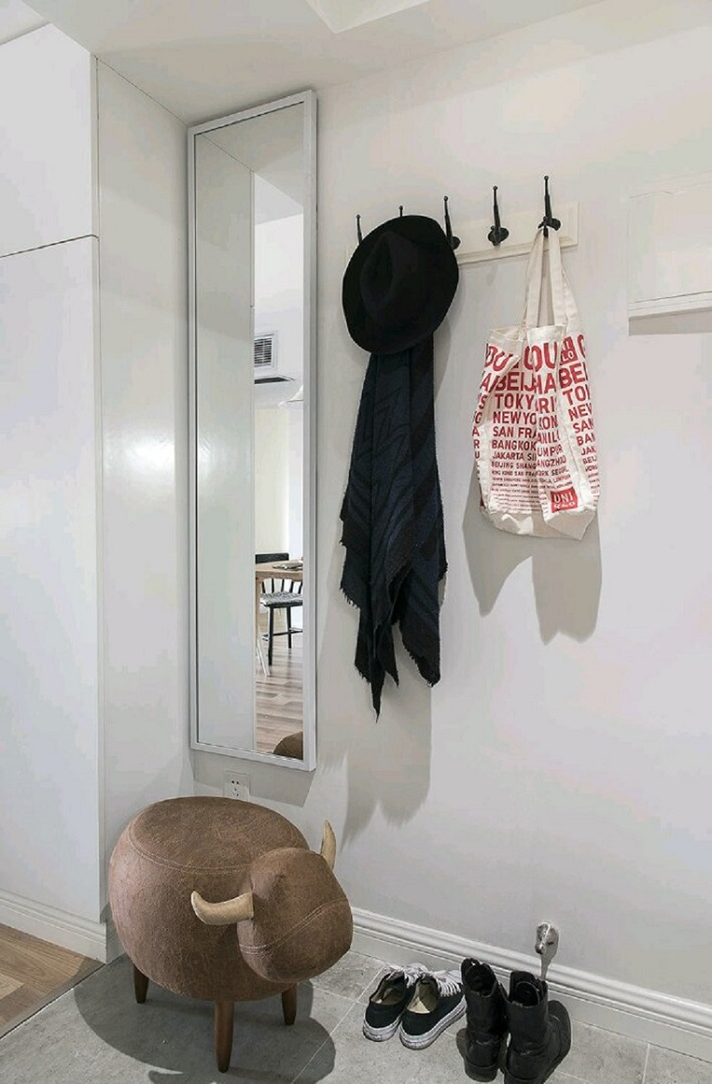 像圖中中那樣,一個簡易的試衣鏡,一個簡易的掛衣架,就能擔負起入戶玄關最首要的作用了。