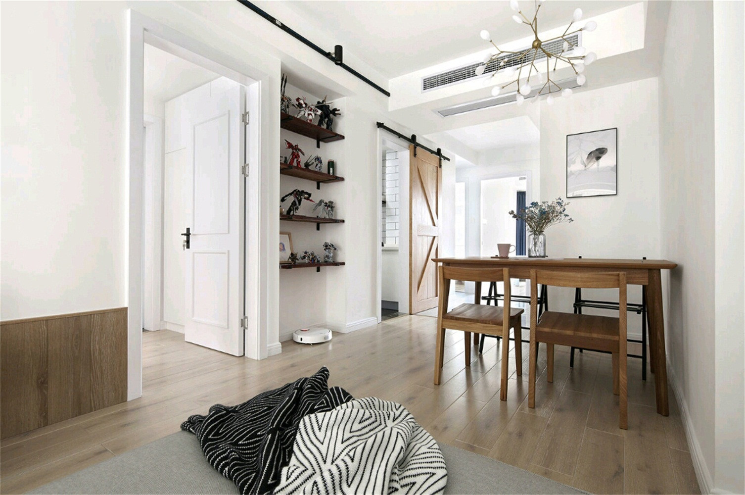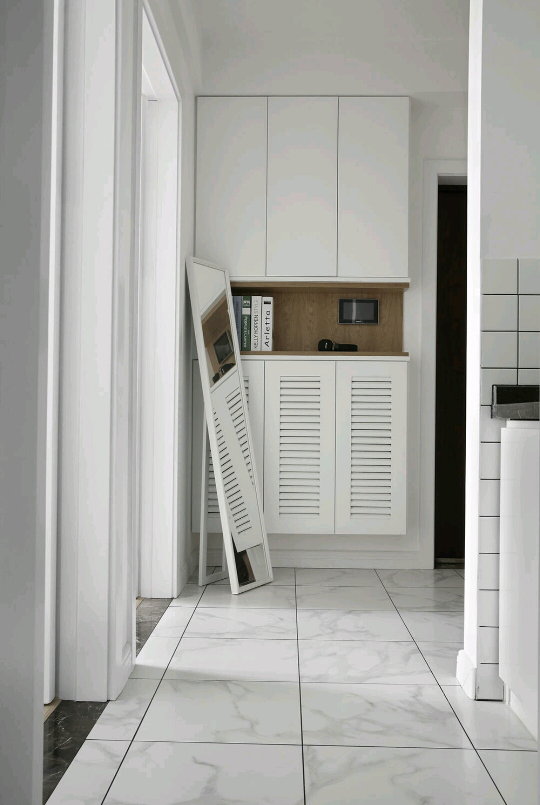 這是入門玄關(guān)處的設(shè)計方案,比較簡單,沒什么顏色,在劃算的情況下好朋友非常少考慮到美觀大方度。一個試衣鏡最好固定不動在墻壁上,可是她買到的這一試衣鏡不適宜固定不動因此就放到這兒了。