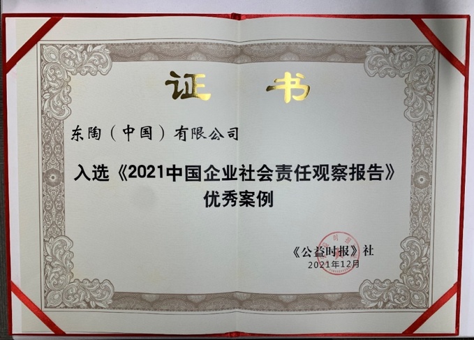 《2021中國企業社會責任觀查匯報》出色實例是由中國民政部負責人的?公益時報?為對在執行企業社會責任層面具備杰出貢獻的公司而開設。TOTO水環境股票基金因一直以來不斷進行支助和進行節水、環境保護行業的慈善活動遭受評審組的充分肯定并獲此榮譽。這也是TOTO在國外初次得到CSR層面的嘉獎。
